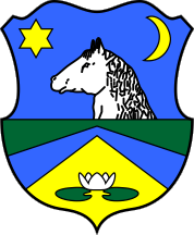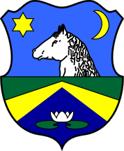 The coat of arms is divided per fess. The upper part is azure (light) blue, a horse head issuant argent surrounded with a mullet and crescent or in the respective cantons. The lower part is vert per chevron or a water lily proper per chevron azure.