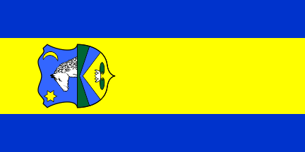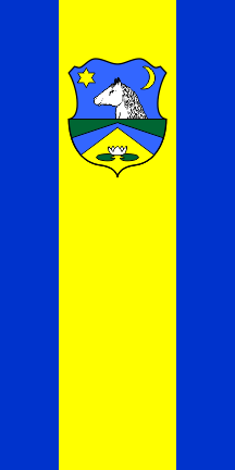 The flag is divided blue-yellow-blue (1:2:1), with the coat of arms set in the upper half (of a vertical flag). The same flag be used for horizontal hoisting, that is, without any rotation of the coat of arms.