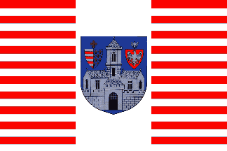 "Óbuda's crest - The first seal, known by us was used between 1370-1380, under the ruling of King Louis The Great. It had been readapted several times until the Turkish occupation, but that design was forgotten later. At the beginning of the new age the figure of the natural lily, later the tulip was applied on the official seal as a symbol for agriculture. In 1991 the district coloured and inserted the seal-figure from the age of Anjou in its newly created crest. On the escutcheon, shaped of a triangle, in the blue field, the castle of Queen Elisabeth- the mother of King Louis the Great- can be seen, being an accurate copy of the original one. The archaeological excavations have brought the foundation onto the surface in Kálvin lane during our century. In the picture of the crest, behind the castle's silver wall there is a tower rising in the middle and on its right and left side there is a tile-roofed building with 2 windows leaning on it as a reflection. Their glaze is also silver. Above, on the one side of the tower the Anjou crest can be seen. An escutcheon divided by a triangle-shaped slash, with a field cut into 7 parts. The red and silver coloured motif in other words the Árpád stripes, referring to the relationship between the Anjou and Árpád dynasties. Opposite side Anjou lilies are filling out the space in the blue field. Above there is a golden Anjou lily floating. On the other side of the tower, also an escutcheon; in a red field, silver Piast-eagle can be seen referring to the fact, that Queen Elisabeth descended from the Polish reigning dynasty. Above the escutcheon there is a smaller version of the silver eagle"