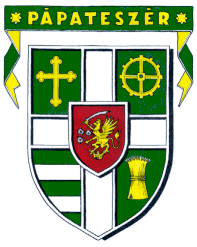 2.§ The Coat of Arms of Pa'patesze'r Village is green-coloured standing Gothic shield split in four by silver stake and stripe, with rosette shield. In the first field there is a clover-ended floating gold Latin crucifix, in the second one there is a floating gold mill-wheel with four spoke, in the third one there are two silver stripes, in the fourth one there is a floating gold wheat sheaf. On the Gothic red rosette shield there is a gryphon looking right, standing on tip-toe on a floating three-armed crown with a silver curved sabre in the right hand and three red-centered silver rose in the left. On a green band floating above the shield there is the name of the village written in gold: "PA'PATESZE'R"