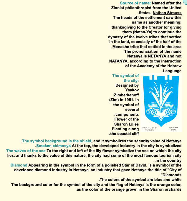 The colours of the emblem are blue and white. The background colour to the city emblem and flag is orange, the color of the oranges growing in the Sharon region citrus plants.