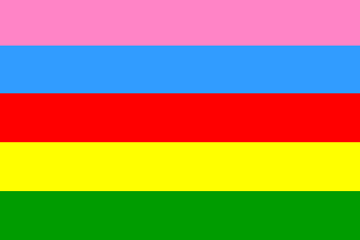 The flag is known. It is a striped flag of light purple (pink?), greyish blue, dark red, yellow and dark green in proportions 1:2 (in the top of the page). In Ed's site, however, and strangely enough (because the picture that was found in FOTW was made originally by him), a different flag is shown: also with five stripes, but the colours are light purple (pink?), greyish blue, red, blue and green in proportions 5:9 (above). Why is this flag different? An error in one of the two? A variation? Different flags used in different historical times?