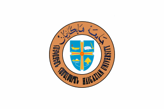 An Armenian university in Beirut. They seem to have three flags; two white ones with slightly different seals (the ring is either gold or blue), and a dark blue flag with the school's 50th anniversary seal. See institutional website.