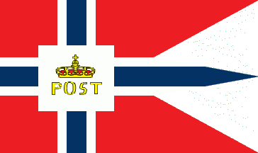The flag is tongued, with a white square on the intersection of the cross, with yellow letters 'Post' surmounted by a crown.