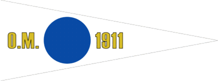 The flag of Oslo Motorbåtforening is a white pennant with a blue disk, to the hoist the letters O.M. in gold, to the fly the date 1911 in gold.