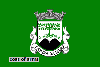 Shield Argent, an eradicated chestnut tree Vert fruited Or, issuant from base a doublemount Sable. Mural crown Argent with three visible towers (village rank) and white scroll with inscription in black capitals "MOURA DA SERRA".