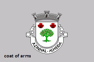 Shield Argent, an eradicated durmast oak Vert acorned Or, in chief two scallops Gules iordered per fess. Mural crown Argent with three visible towers (village rank) and white scroll with inscription in black capitals "AZINHAL - ALMEIDA".
