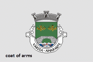 Shield Vert with base wavy of Argent and Azure, charged with a trout Argent, finned and eyed Gules, issuant from base a throughout bridge Argent masoned Sable, having one arch, in chief two sheaves of three wheat ears Or. Mural crown Argent with three visible towers (village rank) and white scroll with inscription in black capitals "VÁRZEA - AMARANTE".