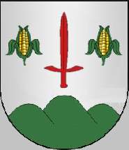 Shield Argent, a sword Gules set in pale, flanked by two corn cobs Or leaved Vert, issuant from base a triplemount Vert, Mural crown Argent with three visible towers (village rank) and white scroll with inscription in black capitals "VIARIZ".