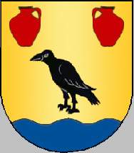 Shield Or with base wavy Azure, a raven Sable, in chief two pitchers Gules set in fess. Mural crown Argent with three visible towers (village rank) and white scroll with inscription in black capitals "AREIAS - BARCELOS".