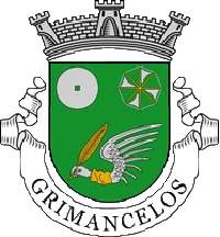 Shield Vert, a winged arm Argent, dressed Or holding a pen Or in hand, in chief a millstone Argent at dexter and a windmill's wheel Or, roped and rigged Argent, at sinister. Mural crown Argent with three visible towers (village rank) and white scroll with inscription in black capitals "GRIMANCELOS".