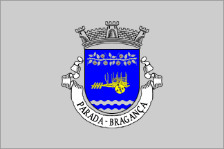 Shield Azure with base wavy of Argent and Azure, a wooden oxcart Or, in chief a branch of chestnut Argent set in fess with nuts of the same slit Gules. Mural crown with three visible towers (village rank) and white scroll with inscription in black capitals: "PARADA - BRAGANÇA".