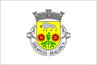 Shield Or two watermill wheels Gules, flanking a chestnut bough Vert fruited Argent in base, and in chief a boar Ermine. Mural crown Argent with three visible towers (village rank) and white scroll reading in black upper case letters "SERAPICOS - BRAGANÇA".