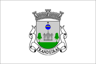 Shield Argent, a belfry Argent, flanked by two trees Vert, issuant from base Vert, in chief an orb Azure garnished Or. Mural crown Argent with three visible towers (village rank) and white scroll reading in black upper case serifed letters "TRANDEIRAS".