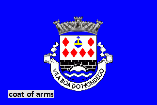 Shield Argent with base wavy of Azure and Argent, an orb Azure fixed Or and flanked by six lozenges Gules ordered 2:4, issuant from base a throughout bridge Sable masoned Argent with one arch. Mural crown Argent with three visible towers (village rank) and white scroll with inscription in black capitals "VILA BOA DO MONDEGO".