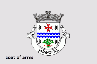 Shield Argent, a bar wavy Azure charged with a barrulet wavy Argent, in chief a Maltese cross Gules flanked by two ants Sable, in base a wheat sheaf Vert tied Gules flanked by two ants Sable. Mural crown Argent with three visible towers (village rank) and white scroll with inscription in black capitals "MINHOCAL".