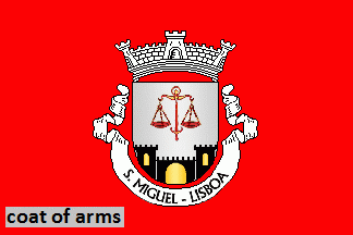 Shield Argent, a pair of scales Gules, balanced by a sword flamant Gules, issuant from base an embattled city gate Sable with port and windows Or. Mural crown Argent with three visible towers (village rank) and white scroll with inscription in black capitals "S. MIGUEL - LISBOA".