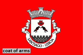 Shield Argent with embattled mural base Sable masoned Argent, two ravens statant respectant Sable garnished Gules, in chief a scallop Gules. Mural crown Argent with three visible towers (village rank) and white scroll with inscription in black capitals "SANTIAGO - LISBOA".