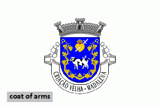 Shield Azure, a cow passant Proper (= Argent spotted sable), surrounded by a wreath of vine Or, fruited and leaved of the same, in chief a heart Or, flaming and pierced by a sword Argent. Mural crown Argent with three visible towers (village rank) and white scroll with inscription in black capitals "CRIAÇÃO VELHA - MADALENA".