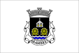 Shield Sable, a belfry Argent masoned Sable with two bells Or, two watermill wheels Or with buckets Argent, all three set one and two, on base wavy Argent a barrulet wavy Azure. Mural crown Argent with three visible towers (village rank) and white scroll reading in black upper case serifed letters "ABAMBRES".