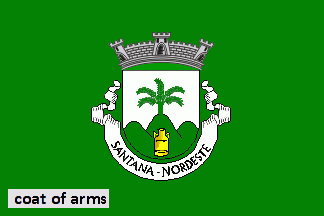 Shield Argent issuant from base a triplemount Vert, charged with a milk churn Or and topped by a fern Vert. Mural crown Argent with three visible towers (village rank) and white scroll with inscription in black capitals "SANTANA - NORDESTE".