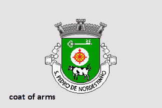 Shield Vert, a plate charged with a compass rose of Gules and Or, in chief a key Argent set in fess, in base a Holstein cow statant proper armed Gules. Mural crown Argent with three visible towers (village rank) and white scroll with inscription in black capitals "SÃO PEDRO DE NORDESTINHO".