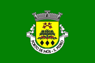 Shield Or, an eradicated potatoe shrub Vert with five potatoes Gules, in chief a pair of keys Gules crossed per saltire, in base three lozenges Sable ordered per fess. Mural crown Argent with three visible towers (village rank) and white scroll with inscription in black capitals "PORTO DE MÓS - S. PEDRO".