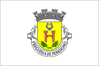 Shield Or, a towered gate Gules masoned Argent, in chief a lyre Azure stringed Argent, in base two chestnut branches Vert fruited Proper with the tips of their stems crossed per saltire. Mural crown Argent with three visible towers (village rank) and white scroll with inscription in black capitals "FREGUESIA DE PENEDONO"