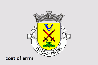 Shield Or, two swords Gules in saltire, in chief a hunting horn Azure, in base an inverted eagle Vert (i.e. facing downwards). Mural crown Argent with three visible towers (village rank) and white scroll with inscription in black capitals "PEREIRO - PINHEL".