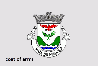 Shield Gules; two olive branches Vert, fruited Sable and crossed per saltire; in chief an eagle Gules armed Sable, in base a valley Vert, issuant from a base wavy of Argent and Azure.Mural crown Argent with three visible towers (village rank) and white scroll with inscription in black capitals "VALE DE MADEIRA"