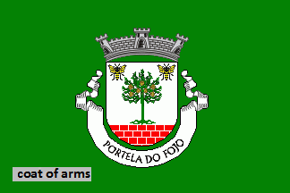 Shield Argent, an eradicated pine Vert with cones Or, flanked in chief by two bees Proper, mural base Gules masoned Argent. Mural crown Argent with three visible towers (village rank) and white scroll with inscription in black capitals "PORTELA DO FOJO".