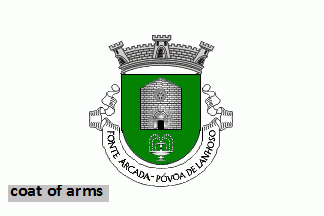 Shield Vert, a monastery Argent masoned Sable, in base a fountain Argent, spitting water of the Same. Mural crown Argent with three visible towers (village rank) and white scroll with inscription in black capitals "FONTE ARCADA - PÓVOA DE LANHOSO"