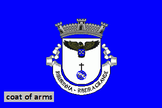 Shield Argent, in base an orb Azure, charged with eight 8-point stars Or, divided 3:5 by a bendy scroll Argent with a black inscription "SSM", on a Latin crosslet Sable, in chief a goshawk Sable lined Or, holding an inescutcheon Azure, charged with five plates in quincunx, in his claws. Mural crown Argent with three visible towers (village rank) and white scroll with inscription in black capitals "RIBEIRINHA - RIBEIRA GRANDE".