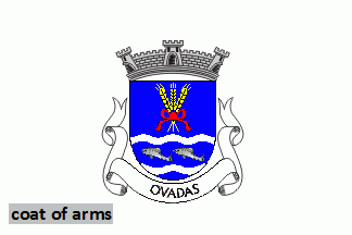 Shield Azure, two barrulets wavy Argent, between them two fish Argent, in chief three wheat ears Or tied Gules. Mural crown Argent with three visible towers (village rank) and white scroll with inscription in black capitals "OVADAS"