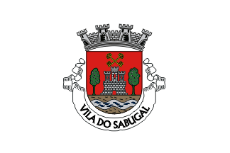 The current coat of arms are gules a castle argent between two Black Elder trees vert fruited argent erradicated vert under a pair of keys or set in saltire and on a campaign wavy argent a fess wavy azure. Mural crown argent with five visible towers (city rank) and white scroll reading in black upper case letters "CIDADE DO SABUGAL". The previous arms differed slightly from the current: gules issuant from a campaign terry charged with a fess wavy sprinkled azure a castle argent between two Black Elder trees vert fruited or under a pair of keys or set in saltire. Mural crown argent with four visible towers (town rank) and white scroll reading in black upper case letters "VILA DO SABUGAL".