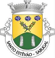 Shield Or, issuant from base a mountain Vert charged with two menhirs Argent in fess, above two branches Vert, one fruited Sable the other fruited Gules in saltire, in chief three stones Sable garnished Argent in fess. Mural crown Argent with three visible towers (village rank) and white scroll with inscription in black initials "SANTO ESTÊVÃO - SABUGAL".