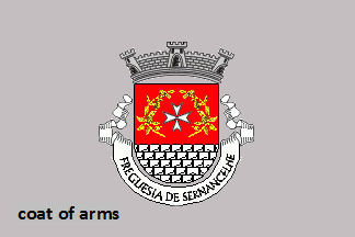 Shield Gules, a Maltese cross Argent, flanked by two chestnut branches Or fruited proper, issuant from base a mural wall Argent masoned Sable. Mural crown Argent with three visible towers (village rank) and white scroll with inscription in black capitals "FREGUESIA DE SERNANCELHE".