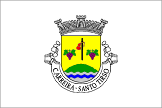 Shield Or; a pilgrim's staff Sable in pale with its gourd Gules tied Gules between two grape bunches Purpure leafed Vert; issuant from base wavy Argent, charged with a barrulet wavy Azure, a mount Vert. Mural crown Argent with three visible towers (village rank) and white scroll reading in black upper case letters "CARREIRA - SANTO TIRSO".