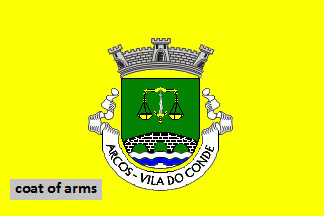 Shield Vert with base wavy of Argent and Azure, issuant from base a throughout bridge Sable masoned Argent, having three arches, in chief a pair of scales Or, balanced by a sword flamant Argent hilted Or. Mural crown Argent with three visible towers (village rank) and white scroll with inscription in black capitals "ARCOS - VILA DO CONDE"