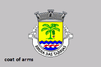 Shield Or, an eradicated banana tree Vert fruited of the same and blossomed Purpure at sinister, base wavy of Azure and Argent, the Argent bar charged with three grey mullets Gules in fess. Mural crown Argent with three visible towers (village rank) and white scroll with inscription in black capitals "RIBEIRA DAS TAÍNHAS".
