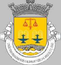 Shield Or with base wavy of Azure and Argent, two fountains Azure, set in fess and pouring water Argent(!), in central chief a sword flambant Gules balancing a pair of scales Gules. Mural crown Argent with three visible towers (village rank) and white scroll with inscription in black capitals "CALDAS DE VIZELA - S. MIGUEL".