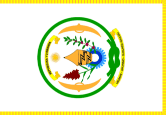 two flags behind him - the national flag and another which had a device