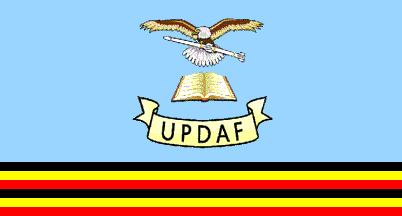 The flag of the Uganda People's Defence Air Force (UPDAF) and follows the same design as the Uganda People's Defence Force flag, having a light blue background below which are six narrow stripes in the colours found on the Uganda national flag (black, yellow, red, black, yellow, red). The emblem of the UPDAF is found in the centre of the green field.