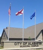 A photograph of the municipal complex appears to show a municipal flag flying. It appears to be a blue flag with the seal on it.