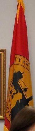The flag appears to be red with the seal centered in black and yellow.