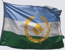 A blue-white-green horizontal tricolor, with a central logo in gold overlying the stripes.