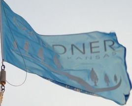 Gardner, Kansas, flag is a blue flag with Gardner, Kansas. In the field of the flag are seven trees along a line that branches which represents the splitting of the Santa Fe Trail from the Oregon / California Trail which occurs two miles south of town. Gardner's motto is "Where the Trails Divide". - from Waymarking website, where you can see the photo of the flag.