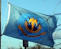 The flag is light blue, with a large blue seal bearing the seal in yellow, showing an eagle before a sunrise. Text on the flag is illegible on the photo provided.