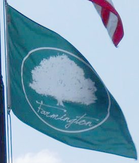 A dark (probably green) flag with a central emblem of a leafy tree in a circle and the name written below.