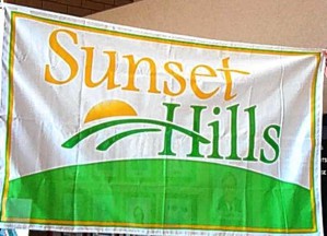 "Sunset Hills' flag has undergone various incarnations but reflects local input is Sunset Hills' flag, which "is symbolic of the natural beauty of the surroundings and lovely sunsets, as reflected in the city's name," said City Clerk Laura Rider. In 1998, to commemorate the 25th anniversary of the city's police department, Communications Officer David Knight designed a new flag, replacing one dating from 1976. After Sunset Hills celebrated its 50th